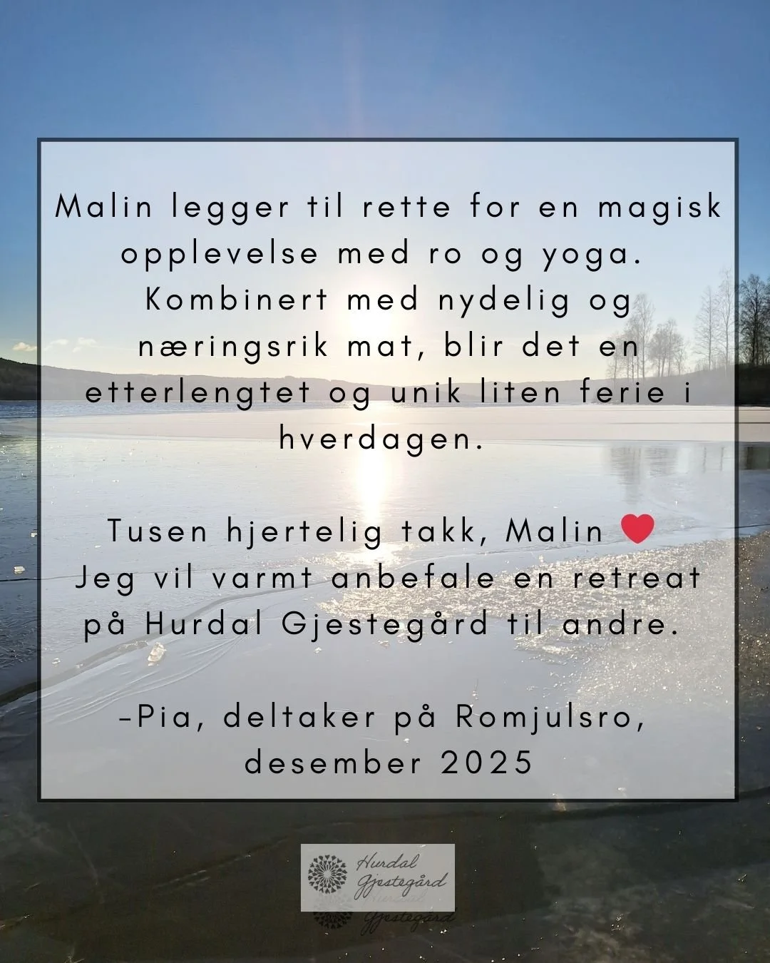 Velkommen til vakre Hurdal Gjestegård og nyt en stille helg i naturskjønne omgivelser. Her får du ladet batteriene gjennom yoga, meditasjon, hvile og avslapping. Med åpne armer ønskes du velkommen hjem til meg, Malin, som vil være din vertinne under hele helgen. Jeg vil gjøre mitt ytterste for å få deg til å føle deg avslappet, velkommen og trygg.